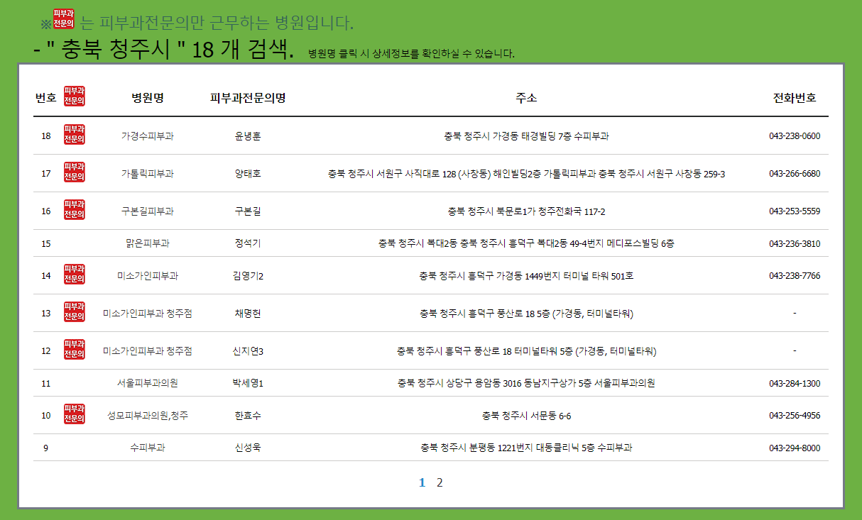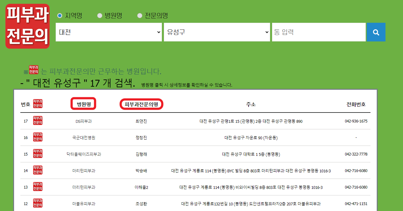 지역명을 정하고 검색하면 하단에 검색결과가 나오는데요. 병원명 뿐만 아니라 피부과전문의명까지 나옵니다.