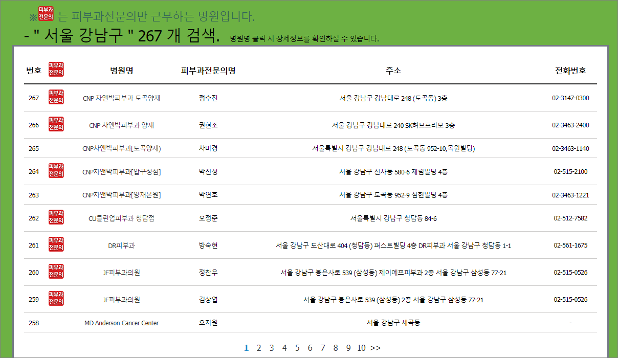 차앤박 피부과, DR피부과, JF피부과의원 등 267개가 검색이됩니다.